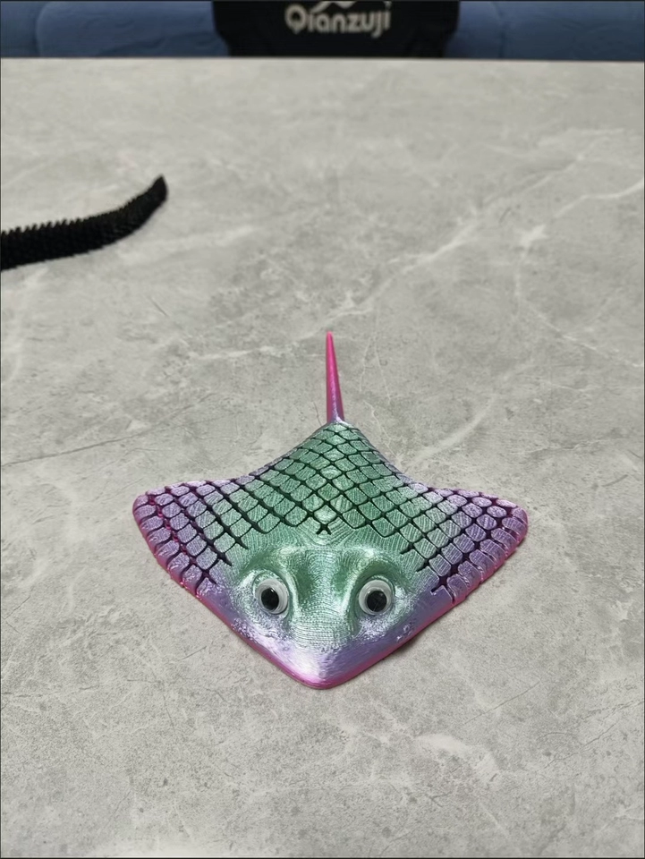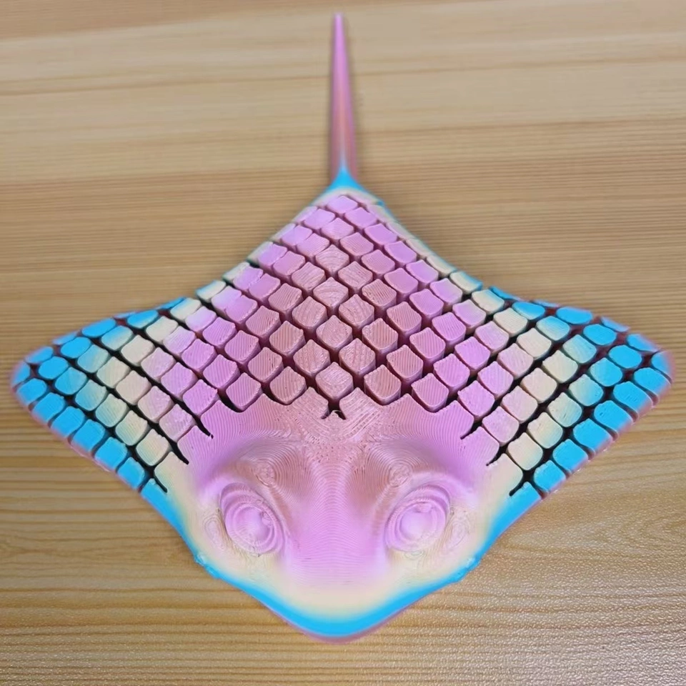 This 3D printed fish features a uniquely designed bottom structure, showcasing advanced 3D printing technology and clever engineering design. The base presents a mesh-like geometric shape with detailed textures and a raised design, enhancing both visual depth and overall stability.