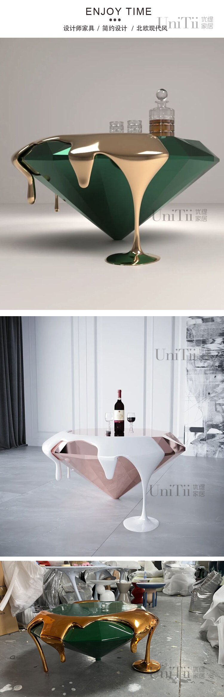 Combining Italian abstract art with French luxury style, this astonishing diamond-inspired coffee table is crafted to perfection. Made with fiberglass material, its design draws inspiration from the allure of fluids and magma, showcasing a unique artistic aesthetic. Not only can it be used as a showcase table in model homes, but it is also the perfect choice for designer-decorated coffee tables. The surface is treated with sun and rain protection, with a strong electroplated color and durable eco-friendly construction. It offers you a dual enjoyment of visual appeal and practicality.