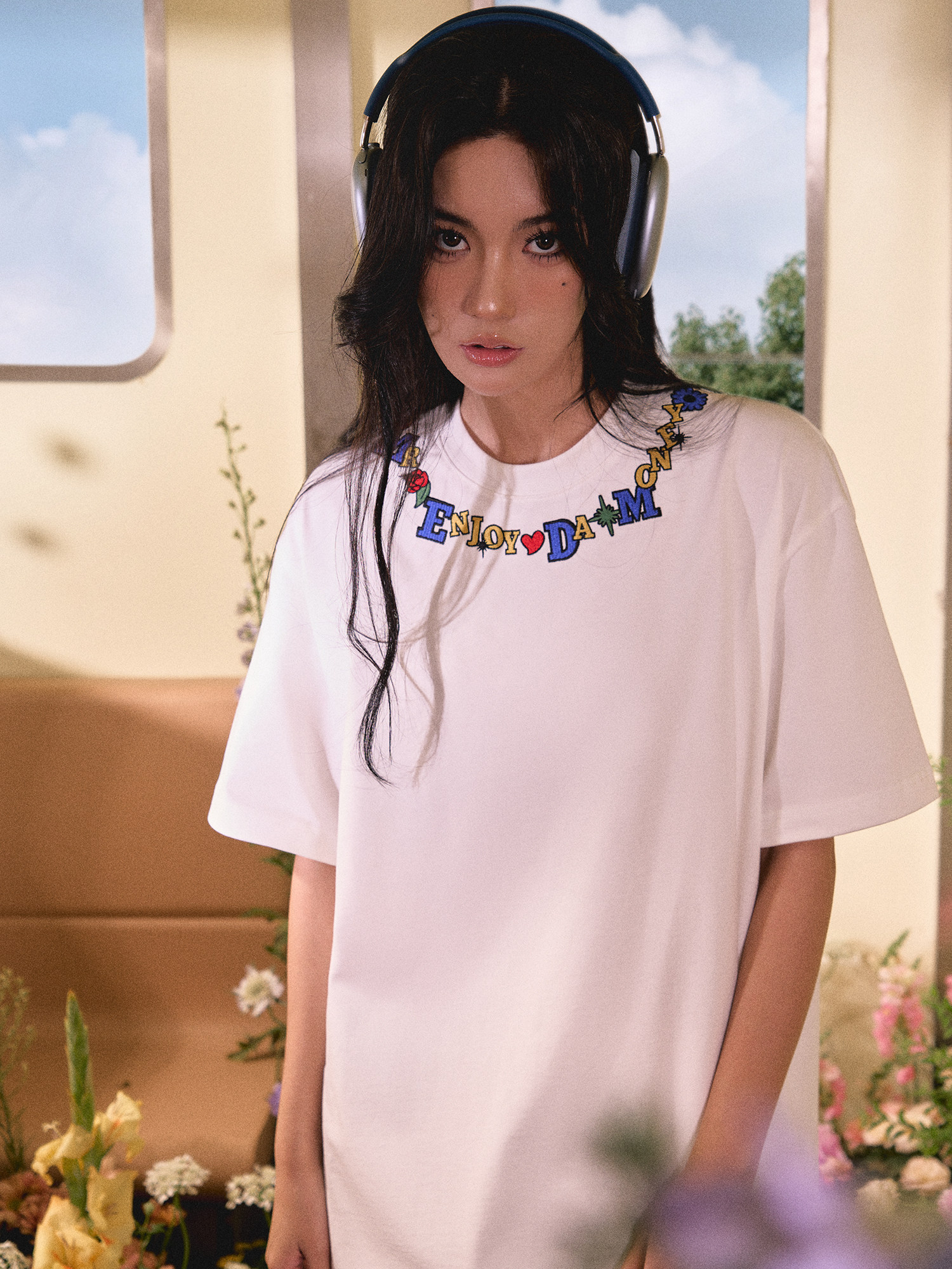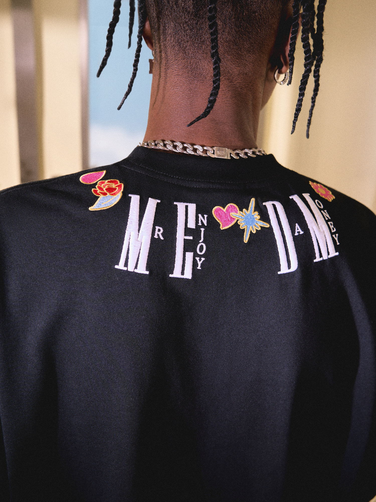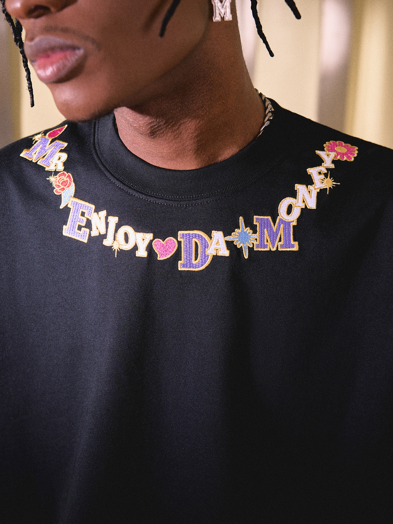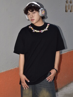 This embroidered necklace t-shirt features a unique embroidered necklace pattern that will make you stand out from the crowd. Whether you’re an urban fashionista or a hip-hop enthusiast, this t-shirt will add a touch of style to your look. The distinctive collar with embroidered letter and flower patterns injects innovation into the classic black and white color schemes.