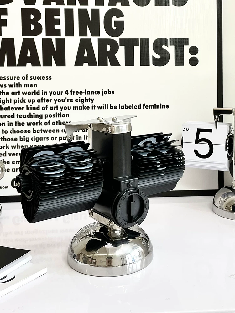 Este reloj electrónico de páginas se inspira en la estética mecánica europea, combinando diseño retro y moderno. La combinación de negro mate y plata metálica le da un aspecto sofisticado y discreto. La pantalla digital es clara e intuitiva, mientras que la función de cambio automático opera de manera silenciosa y fluida. Sirve tanto como herramienta precisa para medir el tiempo como una pieza de arte para tu escritorio. Su diseño ligero se adapta perfectamente a un escritorio, mesa de oficina o mesa de café en la sala de estar. La base de metal, firme y antideslizante, resalta la calidad de su artesanía. Ya sea para uso personal para aumentar la eficiencia o como regalo creativo, añade un toque de estilo industrial vintage a cualquier espacio.