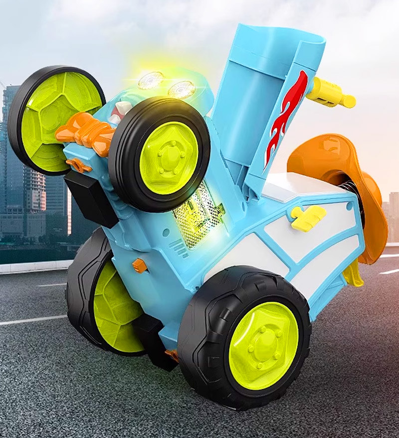 This children’s toy car breaks tradition with its innovative design—a tractor equipped with glowing, smiling headlights performs 360° jumps and 90° upright stunts, while the futuristic blue-and-white battle car features fluorescent wheel hubs and an upright walking system, easily conquering complex terrains. The entire line supports wireless remote control plus dynamic light and music interaction. Anti-slip tires adapt to both indoor and outdoor environments, and food-grade ABS material ensures safety. Let kids ignite their spirit of adventure and creativity through dazzling stunts and tech exploration!