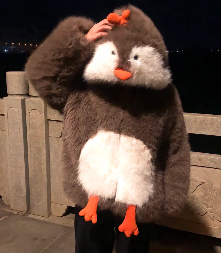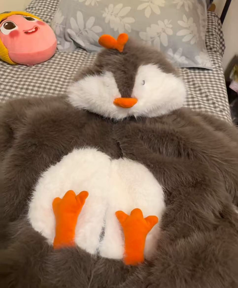 This penguin-shaped plush jacket steals the spotlight with its highly lifelike 3D penguin silhouette. The hood cleverly blends a functional beak opening with decorative sunglasses for wind protection, warmth, and playful interaction. Crafted from faux-fur plush with a cozy brushed lining, it keeps you toasty through deep winter. From subway snaps to daily commutes, it’s both a practical cold-weather layer and a fashion statement—perfect for style-forward families (parent-child looks) and young trendsetters.