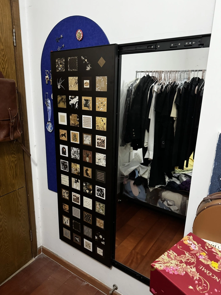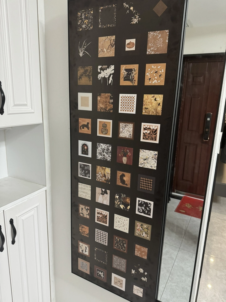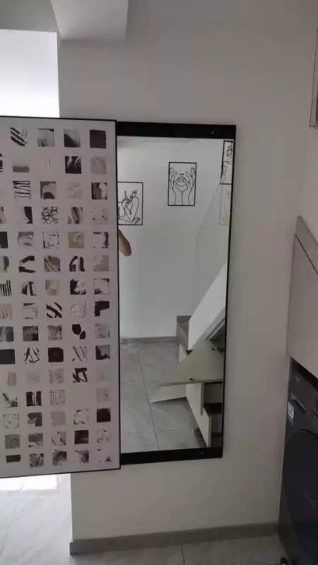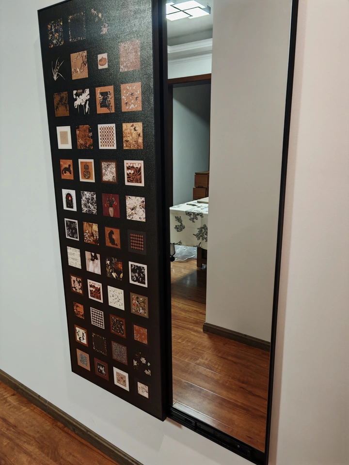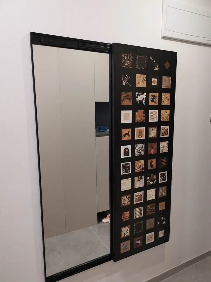Cermin ini menggunakan desain tersembunyi yang efektif menghemat ruang. Pengguna dapat dengan mudah membuka atau menutup cermin dengan mekanisme geser, membuatnya nyaman digunakan. Ketika ditutup, ia berfungsi sebagai lukisan dinding dekoratif, meningkatkan rasa artistik ruangan sekaligus menjadi indah dan praktis. Permukaan cermin terbuat dari bahan reflektif berkualitas tinggi, memastikan efek visual yang jelas, sempurna untuk refleksi tubuh penuh.
