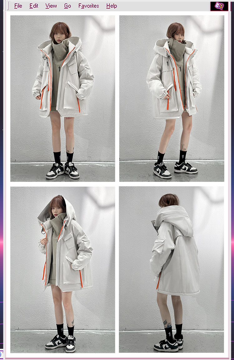 Desain berhoodie secara efektif menghalangi angin dan mempertahankan kehangatan, dengan lapisan tebal untuk meningkatkan kenyamanan. Manset elastis mencegah udara dingin masuk, lebih meningkatkan efek isolasi. Beragam warna dan desain detail memudahkan untuk dipadukan dengan jeans atau celana santai.