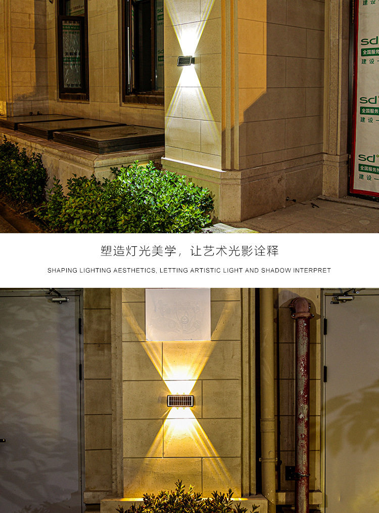 The LED Solar Wall Lights are exquisite outdoor waterproof balcony and courtyard decorative lights that showcase the artistry of light. With their dual-head design and high-intensity up and down light, they create a wash of light on the walls, bringing light aesthetics to your space. These lights feature solar charging, intelligent light control, and other functions, making them easy to install and suitable for various settings. They add practicality and beauty to your outdoor living.