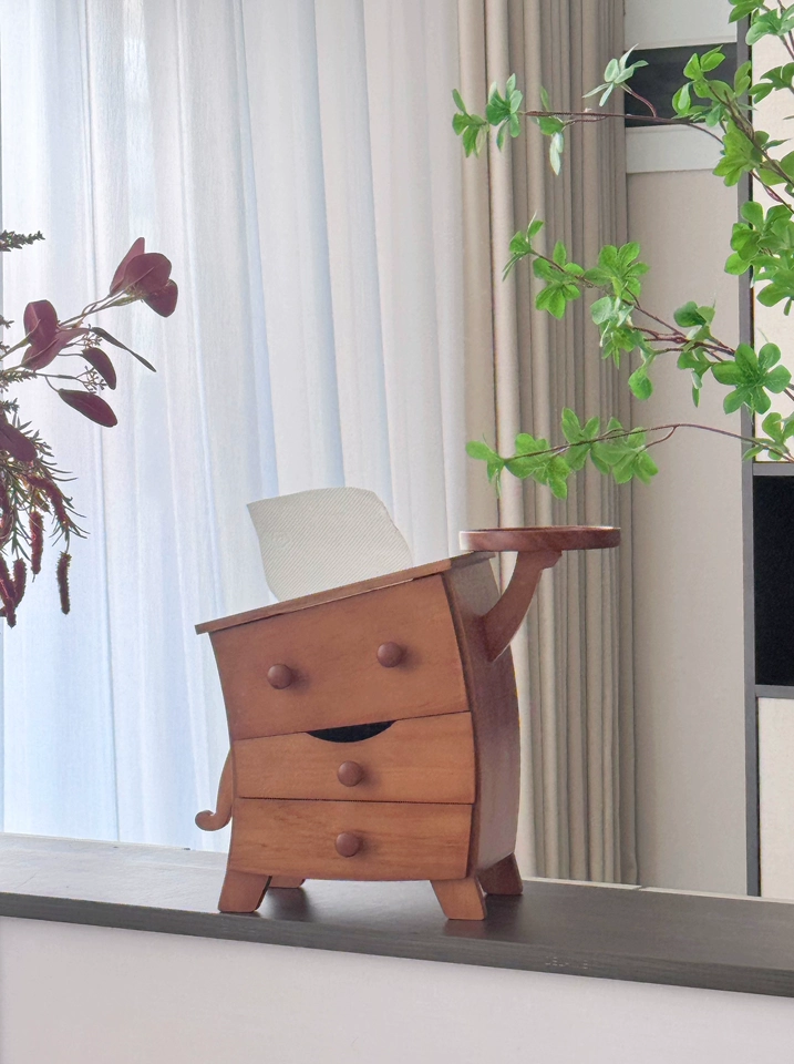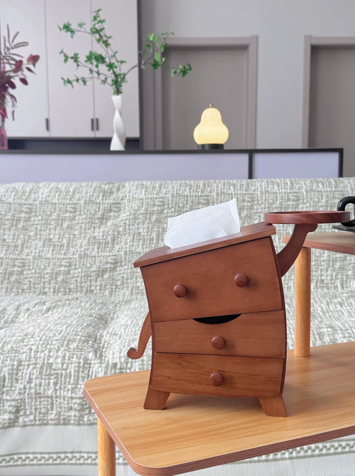 Questa scatola portaoggetti in legno naturale fonde perfettamente l’estetica della natura con il design pratico. Le sue curve biomorfiche ricordano uno spirito del bosco, mentre la fessura per i fazzoletti in cima e i tre cassetti permettono di organizzare chiavi, gioielli e oggetti quotidiani. Realizzata in vero noce nero, senza impiallacciature, con una finitura ecologica e inodore. Che sia un tocco rilassante all’ingresso o un piccolo mago dell’ordine sulla scrivania, il suo design delicato dona un senso di rito alla vita di tutti i giorni.