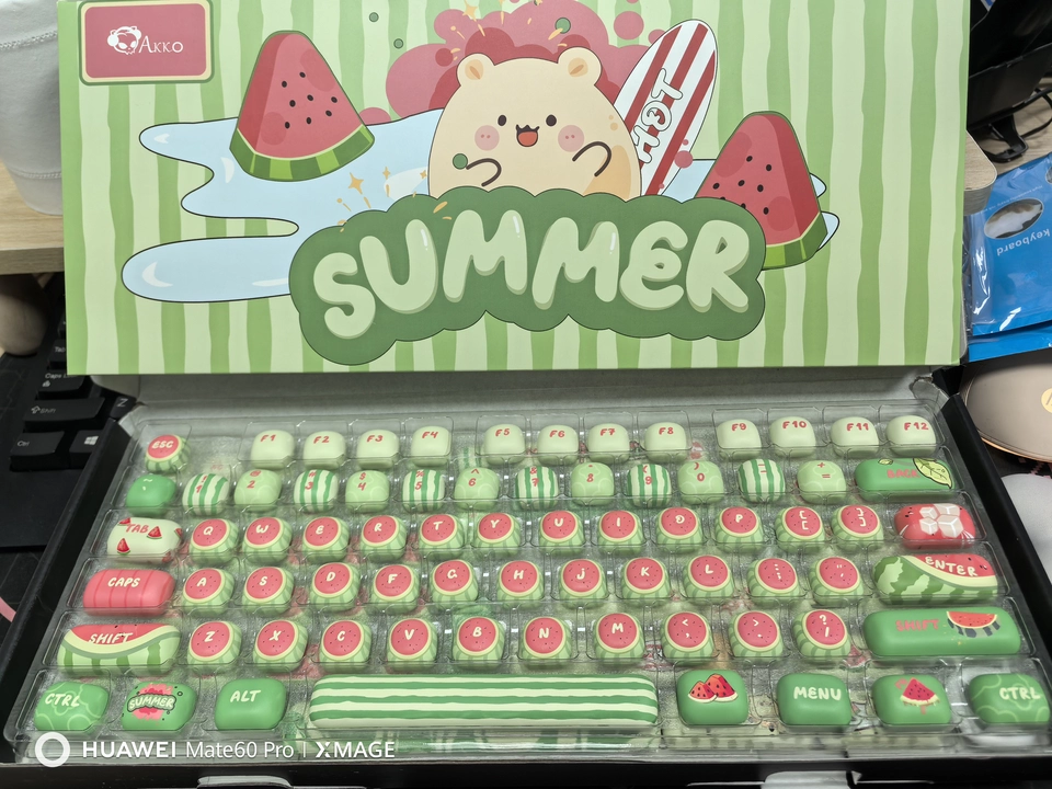 Il tasto Invio è una mini anguria tagliata 🍉, la fila F nasconde motivi di foglie sfumate verdi 🍃, il Caps Lock diventa una borsetta d’anguria. Anche i tasti simbolo sono incisi con minuscoli semi d’anguria! Digitando alla cieca, le texture in rilievo ti aiutano a orientarti—mai più perso.