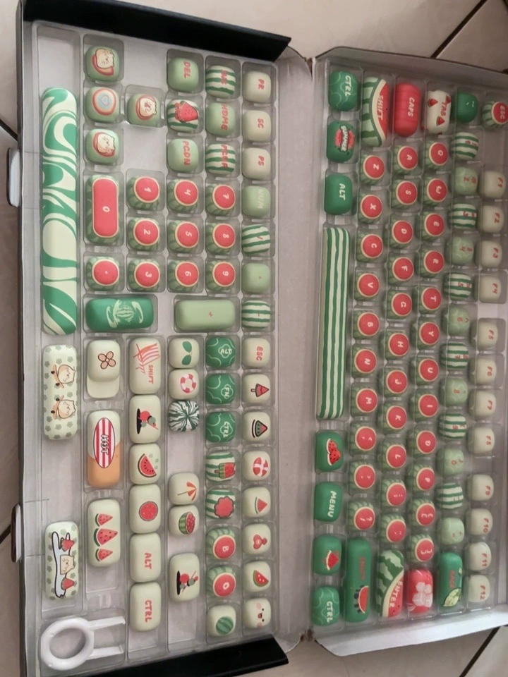 Chi ha detto che i keycap devono essere scatole noiose? Questi tasti rotondi a fungo sembrano fette di anguria 🍄✨. Le strisce rosse e verdi scorrono dall’alto verso il basso, il tastierino numerico ha semi di anguria in rilievo—premere è come affondare il dito nella polpa succosa!