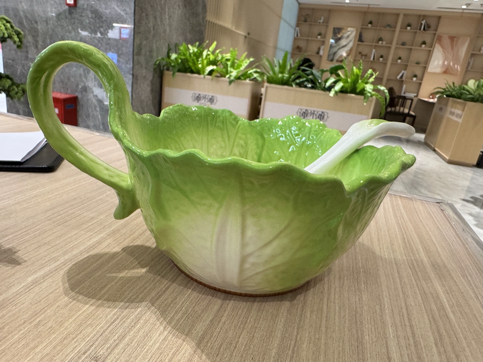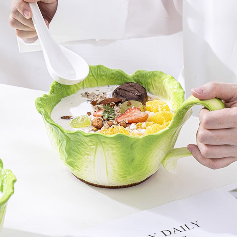 Questa ciotola in ceramica a forma di cavolo è realizzata con la tecnica della pittura sotto smalto, con un delicato motivo verde sfumato e un manico curvo che non scotta e offre una presa sicura. Con un ampio diametro di 17–21,9 cm, è perfetta per tanti tipi di pasti—ramen, insalate, zuppe e altro. Realizzata in porcellana rinforzata resistente alle alte temperature, è stabile, resistente al calore e adatta al microonde. Il bordo ondulato e il cucchiaio a foglia di cavolo abbinato aggiungono un tocco di ritualità e divertimento. Ideale per famiglie e giovani che amano le stoviglie di design, o come regalo raffinato che porta l’estetica naturale sulla tavola.