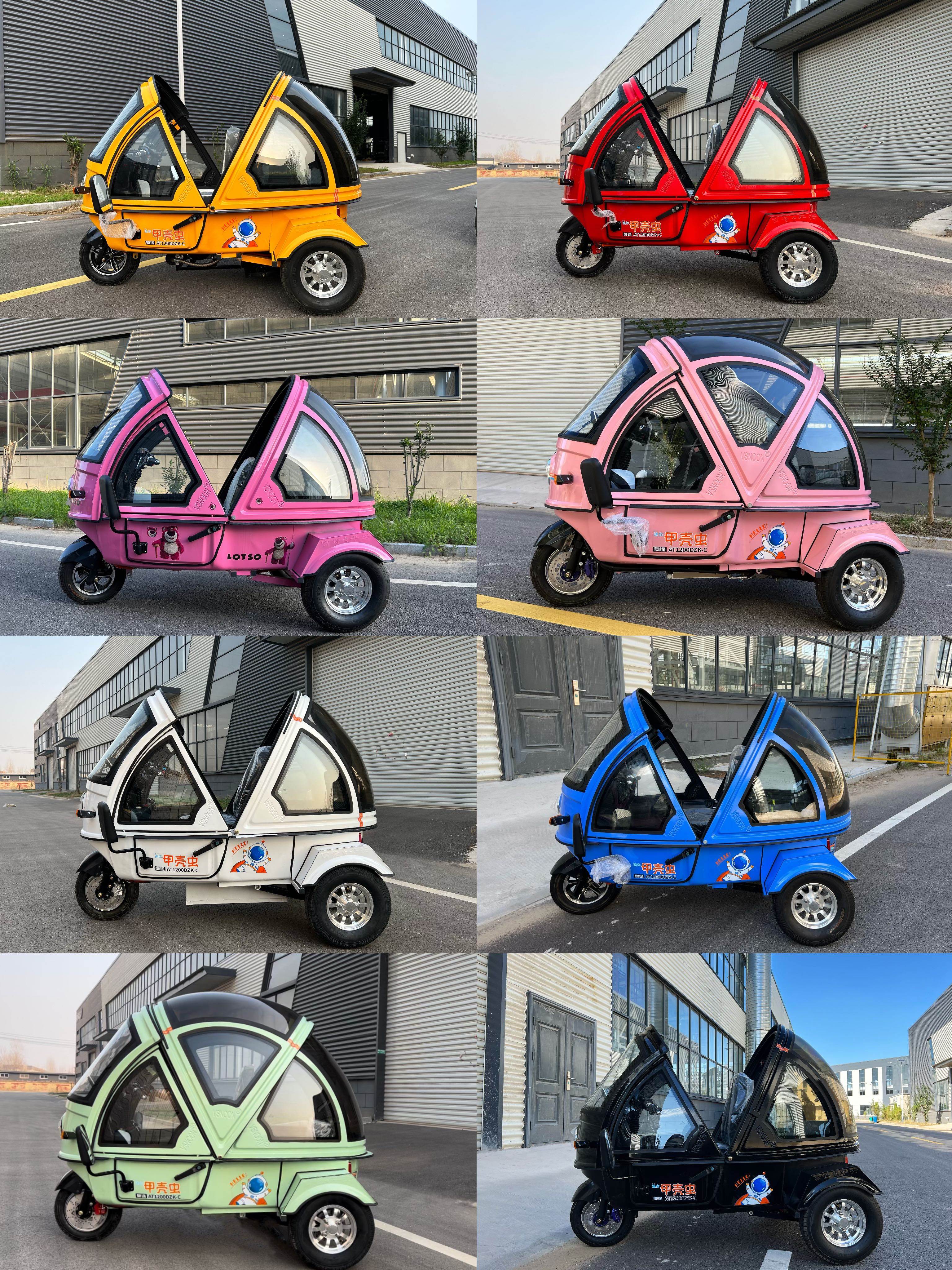 Questo veicolo elettrico mini maggiolino presenta un design elegante e carino, compatto e flessibile. Le dimensioni complessive sono 2,1 metri di lunghezza, 1,12 metri di larghezza e 1,6 metri di altezza. Ha un sistema di sterzo a manubrio, freno a mano standard, freni a disco idraulici su tre ruote, un controller a 18 tubi, un tetto convertibile elettrico controllato a distanza, riscaldamento elettrico, un grande strumento di visualizzazione digitale, radio MP3 Bluetooth, altoparlanti stereo doppi, telecamera di retromarcia, cambio meccanico per salite, ruote anteriori con pneumatici in alluminio vuoto 350-10, sospensione anteriore idraulica, e ruote posteriori con pneumatici in alluminio vuoto 450-10 e sospensione posteriore con smorzamento idraulico con un cambio 1:8.3. La velocità massima è di 60 chilometri all’ora, rendendola adatta per pendolarismo, viaggi a medio raggio, turismo, acquisti o per accompagnare i bambini.