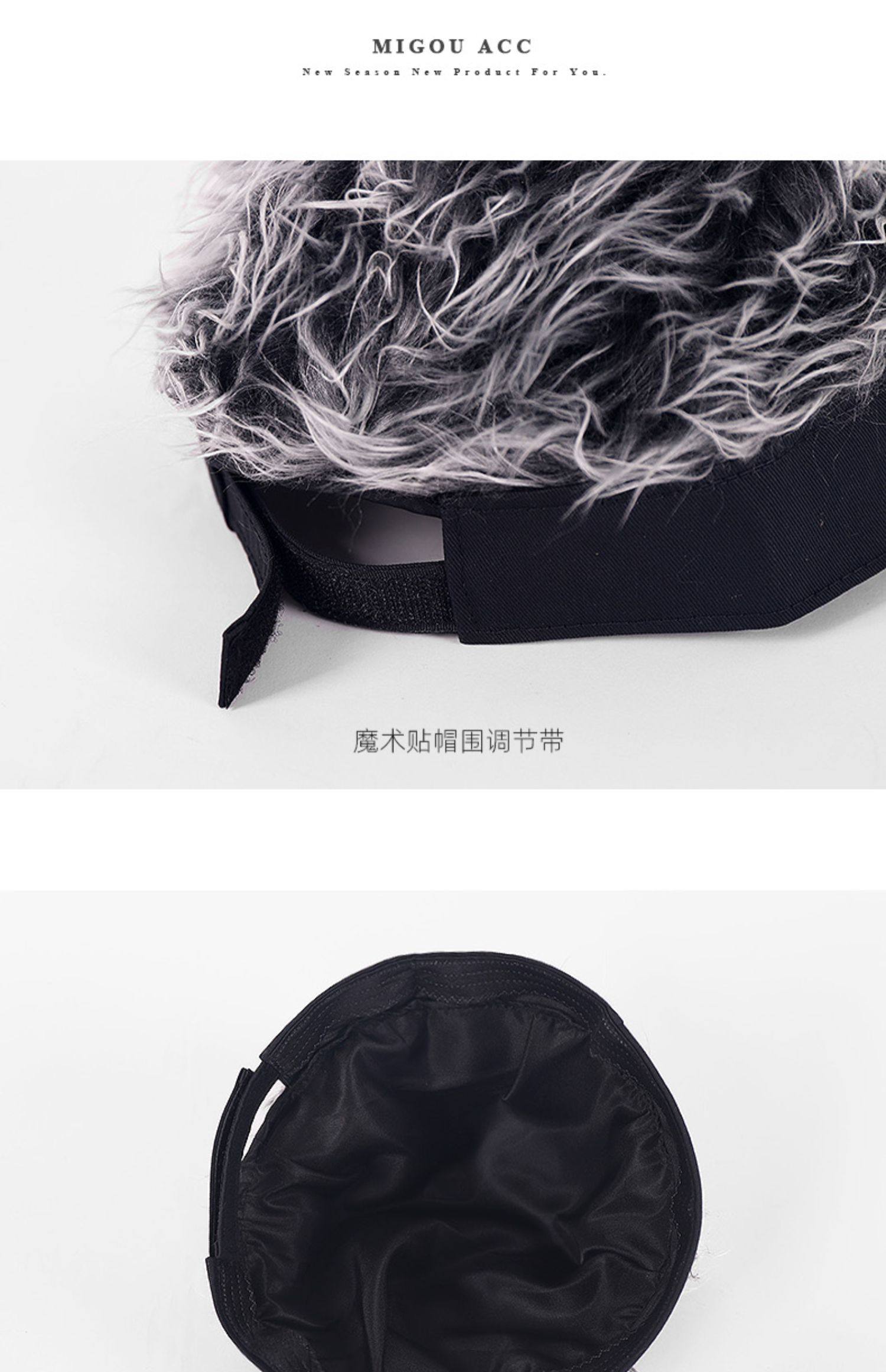 가발 모자의 뒷면에는 다양한 머리 크기에 맞게 조절 가능한 스트랩 디자인이 있어 편안한 착용감을 제공합니다.