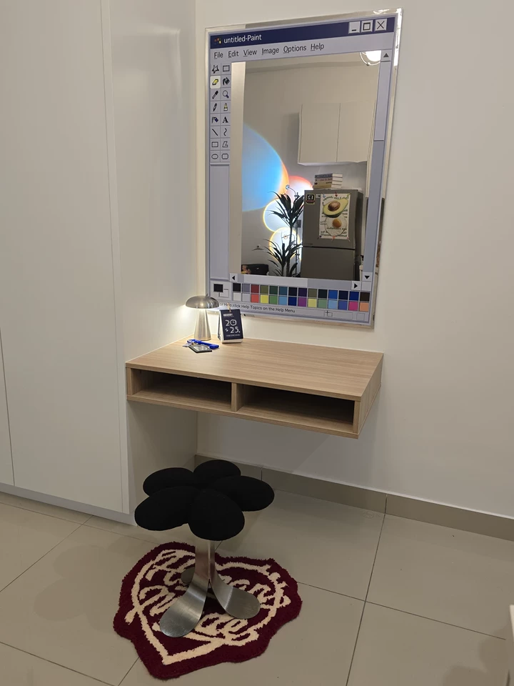 This creative mirror turns the classic Paint drawing interface into reality, using pixel-style tool icons, a colorful palette, and a faux-aged menu bar as the frame—cleverly blending digital nostalgia with everyday function. The mirror is crisp and clear, great as a dressing mirror or desktop accent. It reflects the real scene while creating the playful illusion that “the interface is the window.” Perfect for living rooms, bedrooms, or creative studios—adds a touch of humor and art to your space. It’s both a practical mirror and a conversation-starting wall piece.