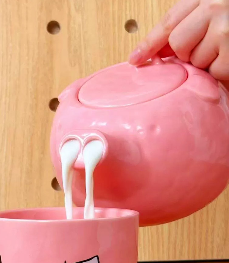 ✨ Design: The spout is a 3D pig nose! When you pour, a milky stream trickles from the nostrils 💦—instant giggles all around. The mug features a goofy pig face 🐷, the double-ring handle feels comfy, and the pink glaze + ceramic finish looks chic, not cheap!