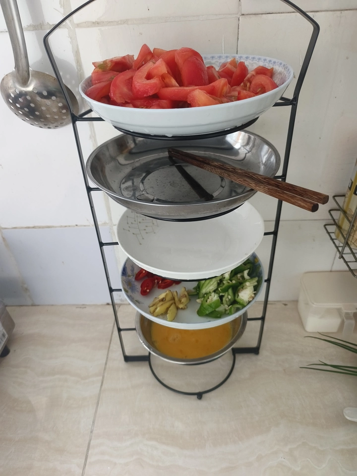 This kitchen preparation storage rack is a versatile and cleverly designed storage solution. The entire rack consists of multiple metal mesh layers, clearly separated, allowing for the placement of different types of ingredients simultaneously for easy access and visibility. The bottom layer is larger, suitable for placing bigger plates or ingredients.
