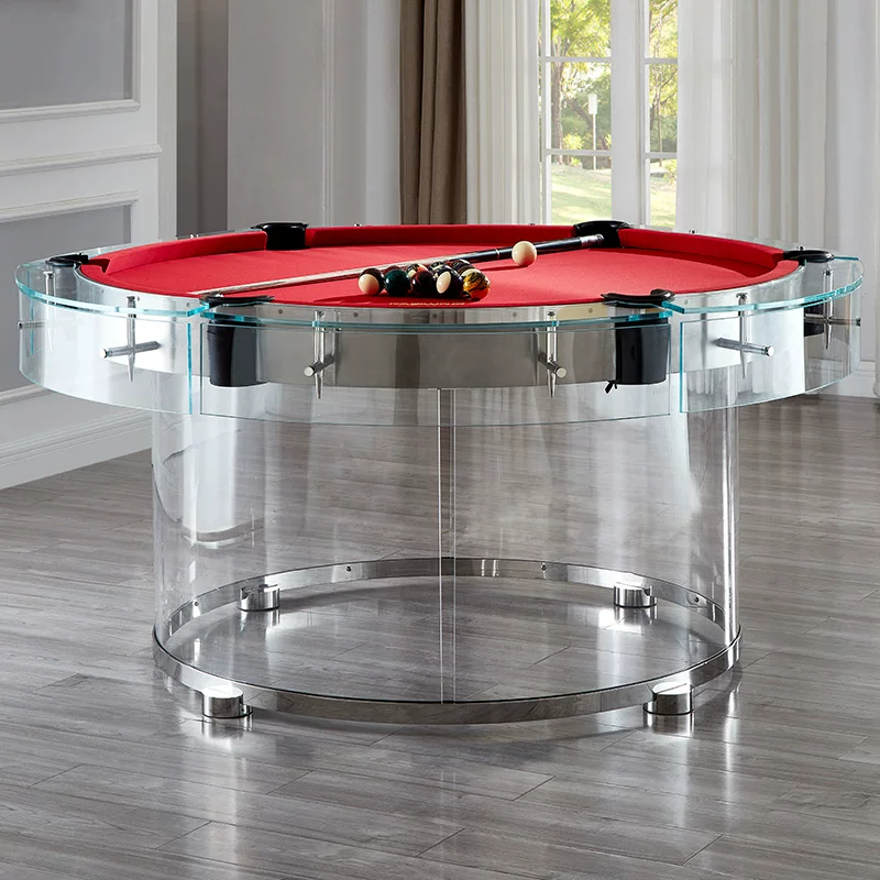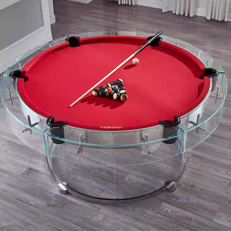 Introducing a revolutionary round billiard table—crafted from fully transparent tempered glass for a stunning sense of visual openness, transforming any space into a work of art. The iconic red playing surface ensures precise, professional-level ball rolls, while the metallic support frame balances commercial-grade stability with luxurious design aesthetics. Breaking free from the confines of traditional rectangles, this table is at home in family living rooms or high-end clubs—igniting competitive fun and becoming the centerpiece of stylish social gatherings, redefining the boundaries of entertainment spaces.