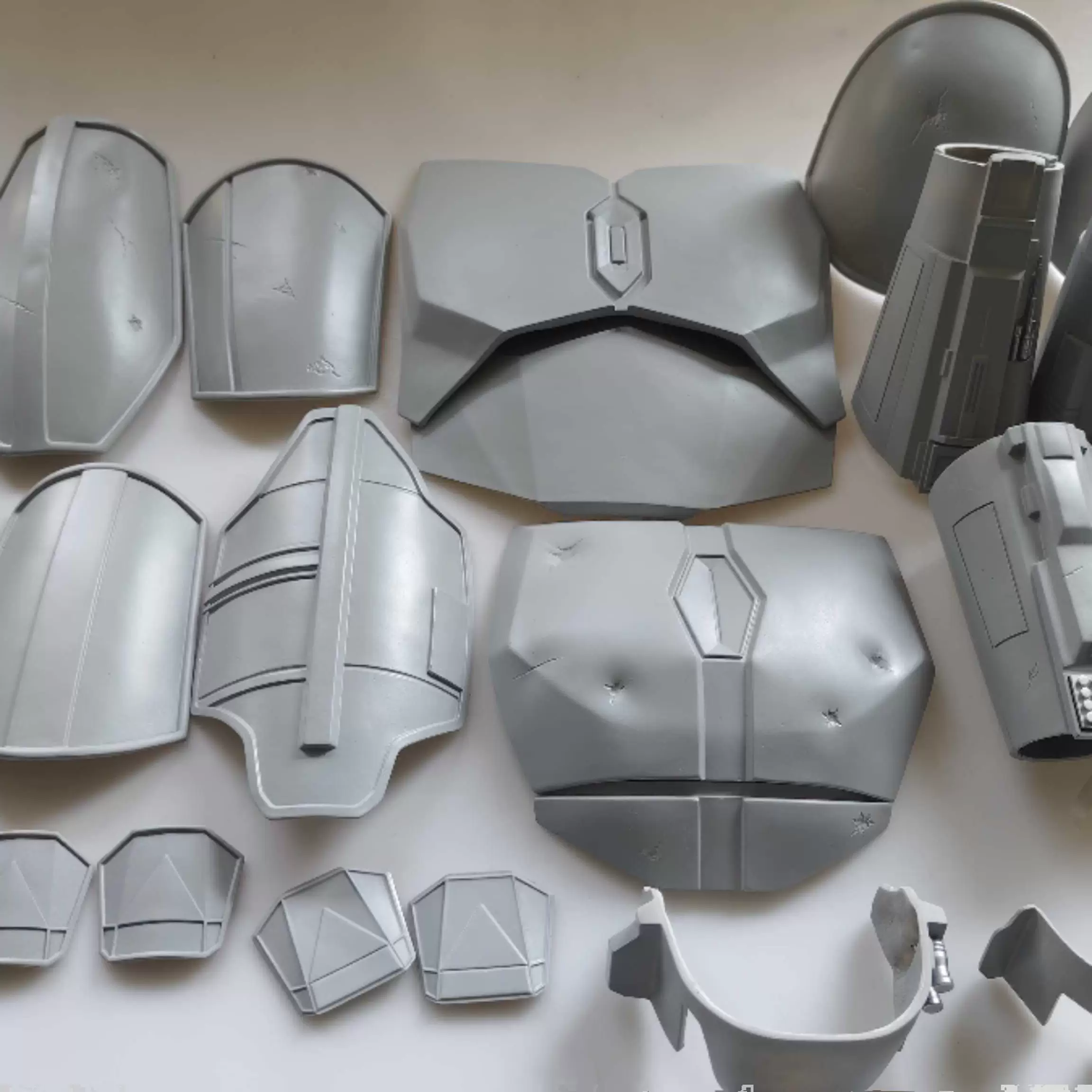 Доспехи состоят из нескольких компонентов, включая грудную броню, наплечники, защиту для рук и доспехи для ног. Каждая часть тщательно обработана, демонстрируя реалистичную металлическую текстуру и тонкие детали, в основном серебристого и черного цветов, объединяя научную фантастику с современным стилем.