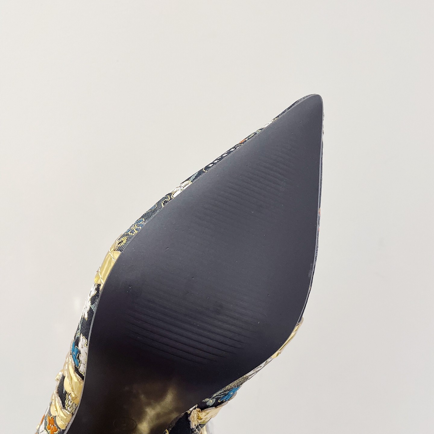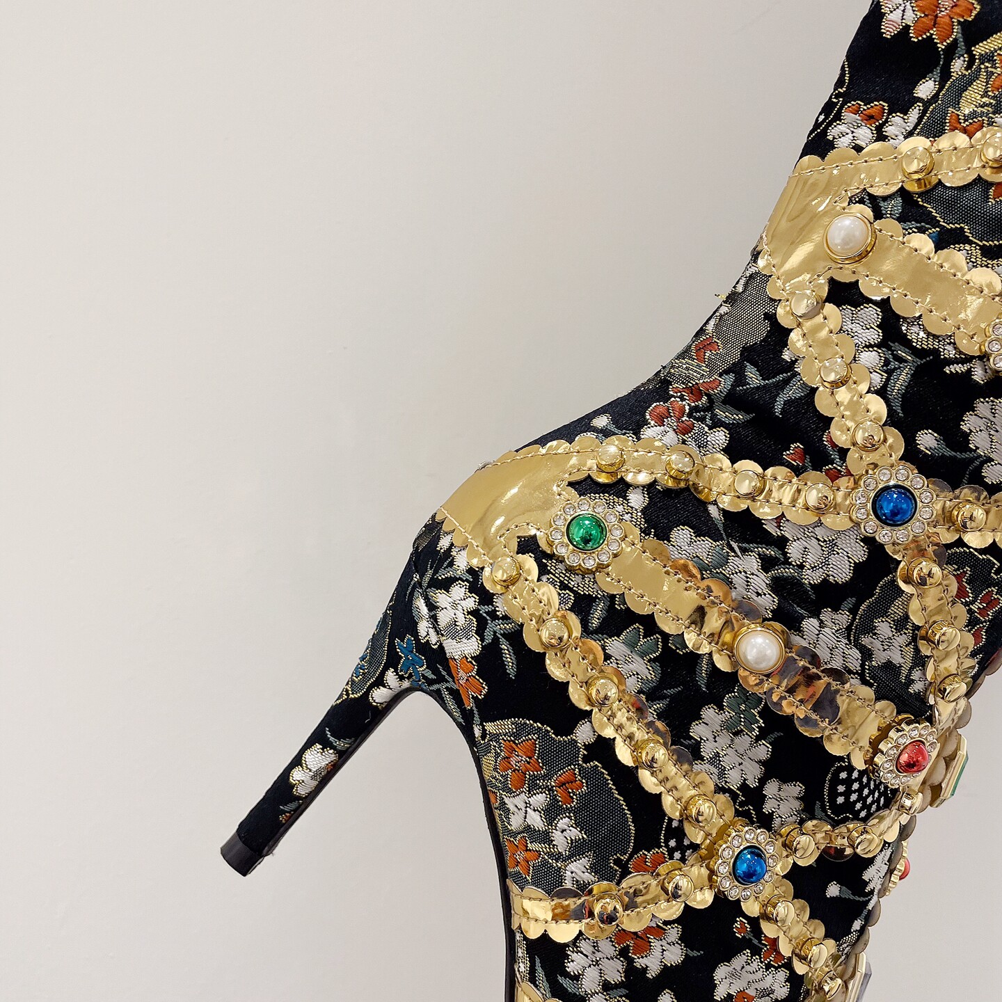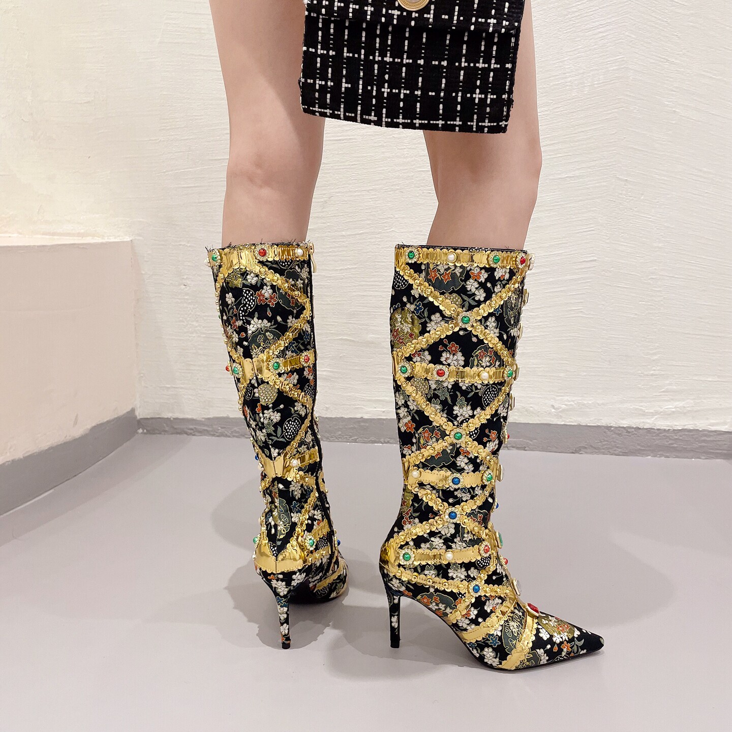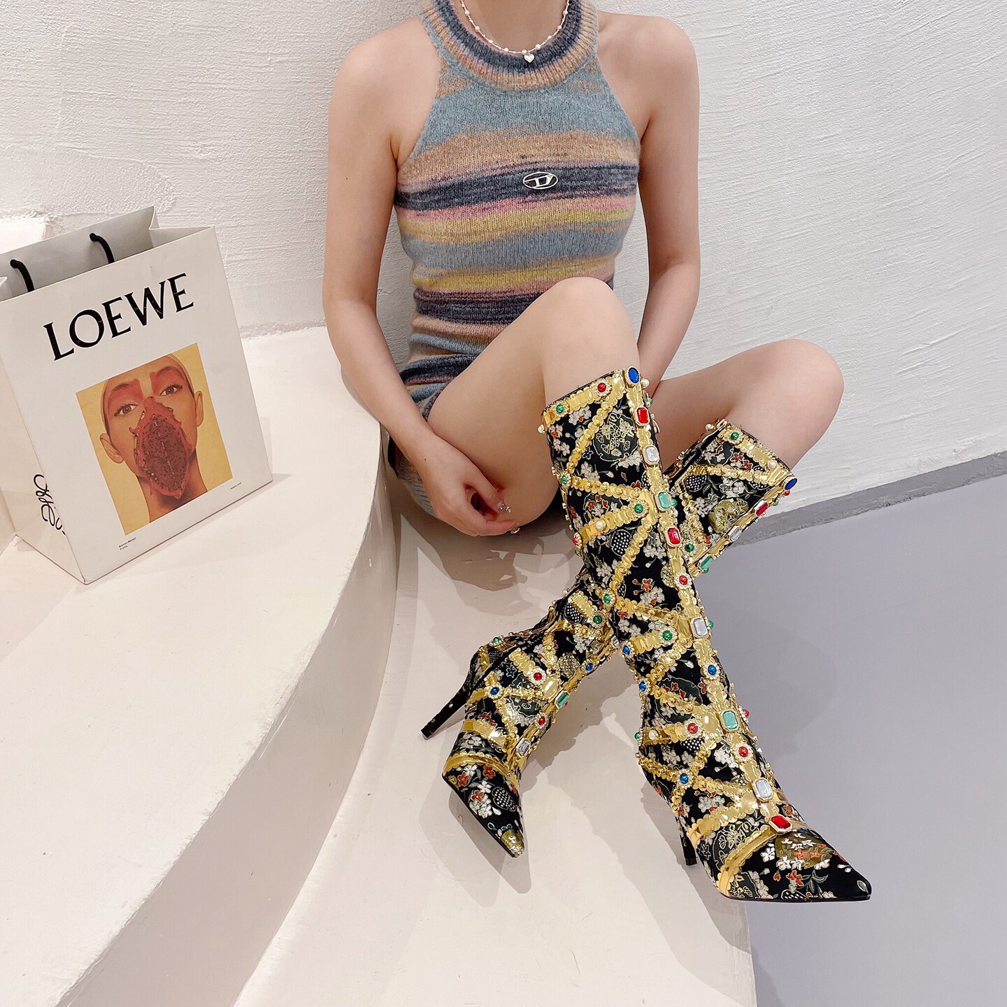 These high boots perfectly combine fashion and sensuality, showcasing a touch of luxury. Inspired by the Renaissance and vintage styles, these boots feature slim heels and pointed toes, highlighting the elegant curves of women. Delicate floral patterns adorn them, emanating an artistic aura. Sparkling diamond embellishments illuminate the overall design, adding a sense of opulence to the boots. Whether paired with dresses or jeans, these boots are the best choice to showcase your personal charm.