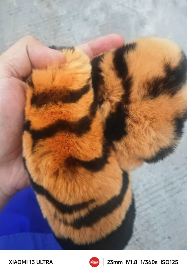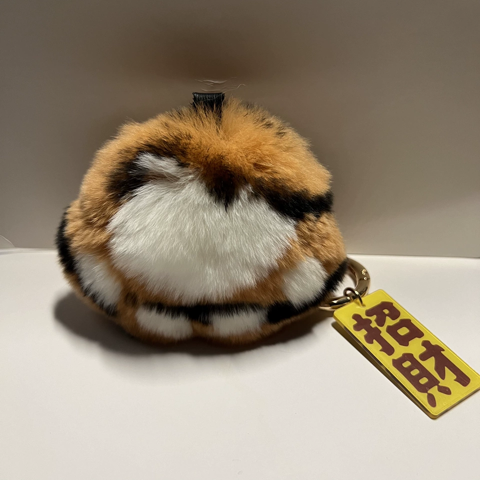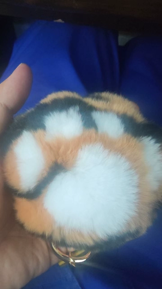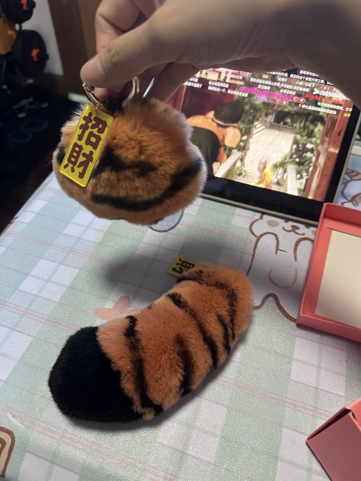 This keychain pendant is inspired by tiger paws and tails, combining fashion and fun. It consists of two parts: a fluffy ball resembling a tiger paw and a long, striped yellow and black tiger tail. The design is lively and adorable, with a soft texture and rich fluffiness. The two parts are connected by a golden metal ring, making it perfect for hanging on bags, keys, or other accessories. Its vibrant colors and lively patterns make it an ideal gift for couples or for special occasions.